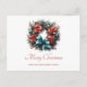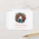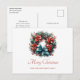 Christmas holiday postcard with a pretty Christmas wreath. A festive image with a pine wreath decorated with red flowers, holly and a lovely blue bow. Delightful.