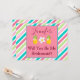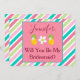 A unique way to ask your Bridesmaids to be a part of your wedding, this invitation features a lovely pink, green and blue diagonally striped background with a pink and blue box in the middle. The box has a template for customising her name with "Will you be my Bridesmaid?" written in lovely burgundy font. Personalise yours today!