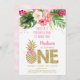 This summery first birthday invitation has beautiful tropical watercolor flowers with faux gold glitter confetti and a faux gold glitter pineapple.