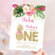 This summery first birthday invitation has beautiful tropical watercolor flowers with faux gold glitter confetti and a faux gold glitter pineapple.