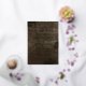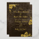 Gold foil pinecone design with hand script style text over a dark contrasting wood print background. Woodland rustic and elegant wedding invitation.