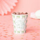 Sweet hand drawn watercolor sweet pea flowers entwined with soft pink pastel ribbon & greenery creating an adorable design for this ‘A Sweet Pea is on the way’ theme baby girl shower. A perfect paper cup to add to your baby shower table setting. Simply as sweet as can be.