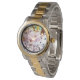 The watch face features a pink abalone shell pattern that is digitally rendered in pastel. Black numbers, frame and detailing add contrast in addition to making it easy to tell time.