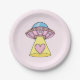 Greetings, Earthlings! Plan an out-of-this-world ufo-themed birthday with this Pink Alien Spaceship Paper Plate. The design features a digital illustration of a pink and purple UFO as it beams up a pink heart. It is perfect for a party celebrating the outer space lover in your life.