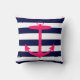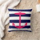 A bright, neon pink silhouette of an anchor is on a navy blue and white striped background. A fun, nautical design.
