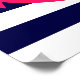 A bright, neon pink silhouette of an anchor is on a navy blue and white striped background. A fun, nautical design.