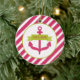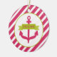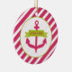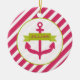 An ornament featuring an illustration of a pink anchor covered by a green banner. Personalise with your name in pink on banner. Anchor is inside circle outlined in green. Background is hot pink diagonal stripes.