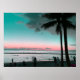 Be inspired when you see this beautiful pink and aqua sky with palm trees and people along the sand and beach in Honolulu Hawaii.