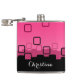 This abstract customisable hip flask features some black, rounded, square bubbles drifting on a pink gradient background. What's going on? I don't know; it's just bold, colourful art! You can add your own name, which appears in white with a fancy script.