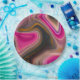 Paper plates with a groovy looking abstract design. Pink and black colours mix and mingle together in a swirling motion. Sprinkles of faux gold glitter in between the layers.