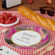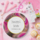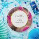 Wedding paper plates with a groovy looking abstract design. Pink and black colours mix and mingle together in a swirling motion. Sprinkles of faux gold glitter in between the layers. A white circle frame with faux gold foil layered over top with your personalised text inside.