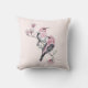 A pillow with a watercolor painting. 2 pink and black birds sitting on a tree branch with pink blossoms.