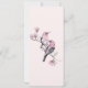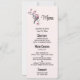 Wedding menu card with a watercolor painting. 2 pink and black birds sitting on a tree branch with pink blossoms.
