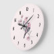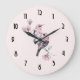 A clock with a watercolor painting. 2 pink and black birds sitting on a tree branch with pink blossoms.