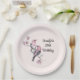 Paper plates with a watercolor painting. 2 pink and black birds sitting on a tree branch with pink blossoms.