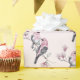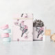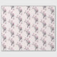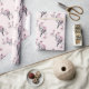 Wrapping paper with a watercolor painting. 2 pink and black birds sitting on a tree branch with pink blossoms.