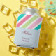 Pink and Blue bride to be can cooler is a one of a kind koozie for your bridal shower party. The front top half features pink blue and green diagonal stripes and the bottom half displays blue background. The bride's information is in customisable pink font.
