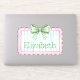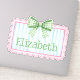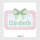 This cute sticker features a pink frame with blue and white stripes and topped with a preppy green and white gingham plaid bow. Personalize with your choice of name or special text. Fun for personalized party favors and gift bags.