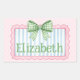 This cute rectangle sticker features a pink frame with blue and white stripes and topped with a preppy green and white gingham plaid bow on a background of pink and white polka dots. Personalize with your choice of name or special text.