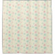 A shower curtain with a cold and wintery christmas pattern. A repeating pattern of pink and blue snowflakes set on a cream coloured background. A seasonal winter time holiday design.