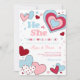 Adorable valentine themed gender reveal invitation with pink and blue hearts.