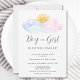 It features pink and blue watercolor clouds with a smiling sun and stylish script typography that says "Boy or Girl."