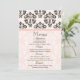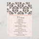 Customise this pretty pink and brown lightly distressed vintage antique damask wedding menu card with a pink and white damask background and pink ribbon design with what you will be serving on your special day. Design © Chrissy H. Studios, LLC. All Rights Reserved.