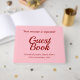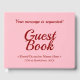This simple event guestbook features the messages "Guest Book" and "Your message is requested!", along with a personalised date event/occasion name. The text is coloured dark red, and the background is coloured pink. A generic, customisable guest book like this could perhaps be used at an event such as a family reunion, a birthday party, a wedding anniversary celebration, a wedding, or some other event with guests who may want to leave a message.