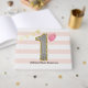 Beautiful pink and gold 1st birthday guest book for her. The background is a soft pink and white striped design. The front cover features the number one in a black and white stripe with a gold glitter trim. Please note there is not actual glitter on this 1st birthday guestbook, but a design effect. Please see photos. You will be able to easily personalise with her name on the front. A beautiful birthday keepsake for her.