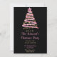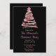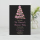 A pink and gold christmas tree on a black background. The back of the invite is black with snow pattern