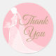 Pink and gold elegant lace gown bridal shower thank you, classic round sticker featuring a bride wearing an elegant lace wedding gown on a blush pink background with beautiful gold script text for your thank you message. Perfect for envelope seals and favour stickers. You can customise the background colour to coordinate with your wedding theme.