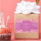 A product label featuring a pink damask pattern in the background. Has space for your logo and website.