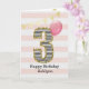 A pink and gold 3rd birthday girl card, which you can personalise with her name. The front of this beautiful 3rd birthday card for her features the number three in a black and white stripe with an outline of glitter with a pink balloon ready to float way. Please note the gold glitter is a design effect and no actual glitter will be on this birthday card. The background is a soft white and pink with a gold bunting banner at the top.The inside message can be easily personalised if you wanted. A pretty 3rd birthday card keepsake for her.