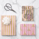 Faux foil vintage Paris pink and gold patterned wrapping paper featuring stripes, grapes, and the Eiffel Tower.