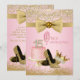 Pink and gold Quinceanera invitations with beautiful pink and gold cake with diamond numbers, gold glitter high heel shoes and elegant diamond and gold tiara on a pink and gold background. You can easily customise these beautiful pink and gold Cinderella princess Quinceanera invitations for your event by simply adding your details in the font style and wording of your choice. This is a printed design with no real glitter, diamonds, bows, etc.