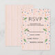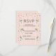 A simple RSVP card with pink and gold stripes in the background. Pink blue and orange confetti (just an image not real) sprinkled around with little green leaves along the side.