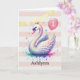 A beautiful swan princess birthday card for her 1st birthday. You can personalise this birthday swan card with her name and age. Features pink, gold and a pretty swan princess with a pink balloon on the front. The inside card message can be also personalised if wanted. A beautiful birthday card keepsake for daughter, granddaughter, etc.