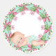 Pink and Green Baby Shower Sticker with Baby Boy and floral wreath