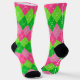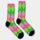 Preppy sporty pink, green and white argyle. The argyle pattern has long been recognised as a classic design that has stood the test of time. The repeated diamond-shaped pattern evokes a sense of sophistication and elegance, adding a touch of refinement to fashion accessories The symmetry and precision of the pattern also align with the sometimes meticulous angles and shots of the sports like golf and pickleball. Additionally, the combination of bold and contrasting colours within the argyle design creates visual interest and makes a statement. Overall, the argyle pattern has timeless charm, aesthetic appeal, and ability to add a touch of style and personality to any outfit. Colourful many shades of pink and green with white stitching argyle fashion socks.