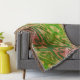 A soft throw blanket in shades of pink and green, including lime and chartreuse, in undulating waves inspired by layered stone patterns. A bright and colourful Boho chic blanket to wrap up in.