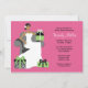 Invite the guests for a bridal shower in style with this modern and fun bridal shower invitation. This pink and green invitation features an African American bride sitting on a chair surrounded by gifts.