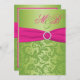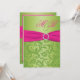 This FAUX embossed spring green floral damask with a hot pink PRINTED ribbon and printed jewel buckle wedding invitation is perfect for a fuchsia pink and green wedding theme, a spring wedding, summer wedding, or other special event. The paper choice is also customisable. If you require any other matching items, or would like this in a different colour combination, please email your request to niteowlstudio@gmail.com