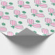 This birthday wrapping paper features a pattern of pickleball paddles. Colours include pink and green.