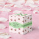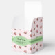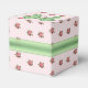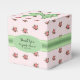 Cottage chic wedding favour box done in a lovely pink and white stripe pattern with pink roses, with graphics of a green satin looking bow, on the top, and ribbon, around the middle of the box. A green and white oval text plaque, on the front, has black custom text ready to personalise. Lovely little gift box for candies and anything else you want to give your guests.