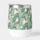 This design has tropical banana leaves on a pink background. In the centre of the coaster is a fresh coconut drink with a cocktail umbrella and striped straw. You can personalise with a name!