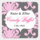 Pink and Grey Damask Candy Buffet Sticker. Great for Candy buffets or cupcake tables at weddings, birthday parties, Baby showers, Communion, Confirmations and lots more! Design features background with pink damask print on slate grey background. A curly bracket tag in white features your chosen text!