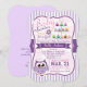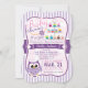 It's a girl! Cute, colourful pink and purple owl theme baby shower invitation on pastel purple and white retro stripes pattern. Features, pink, coral, yellow, blue, green, purple, brown, white, and orange cupcakes, purple and yellow flower, and lavender purple owl. Great for girly owl, spring theme baby showers! Vintage, elegant bracket shaped invite.