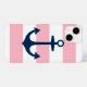 Dress up and protect your iphone with a trendy and stylish navy blue boat anchor and wide white nautical stripes patterned design. Pink background colour can be modified.