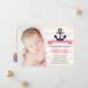 A sweet pink and navy blue nautical themed baby birth announcement with an anchor and heart on a rope, banner, and seersucker diagonal striped navy and white border and stitched pink ribbon look design on the back. Cream and white striped background on the front. Add 3 photos to this baby announcement. One on front and two in the back. Artwork © Chrissy H. Studios, LLC. All rights reserved.