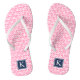 Our pink and navy preppy monogrammed flip flops are a summer staple! Design features a modern greek geometric pattern in bright candy pink and white, with your monogram displayed on a navy blue square badge on each heel.